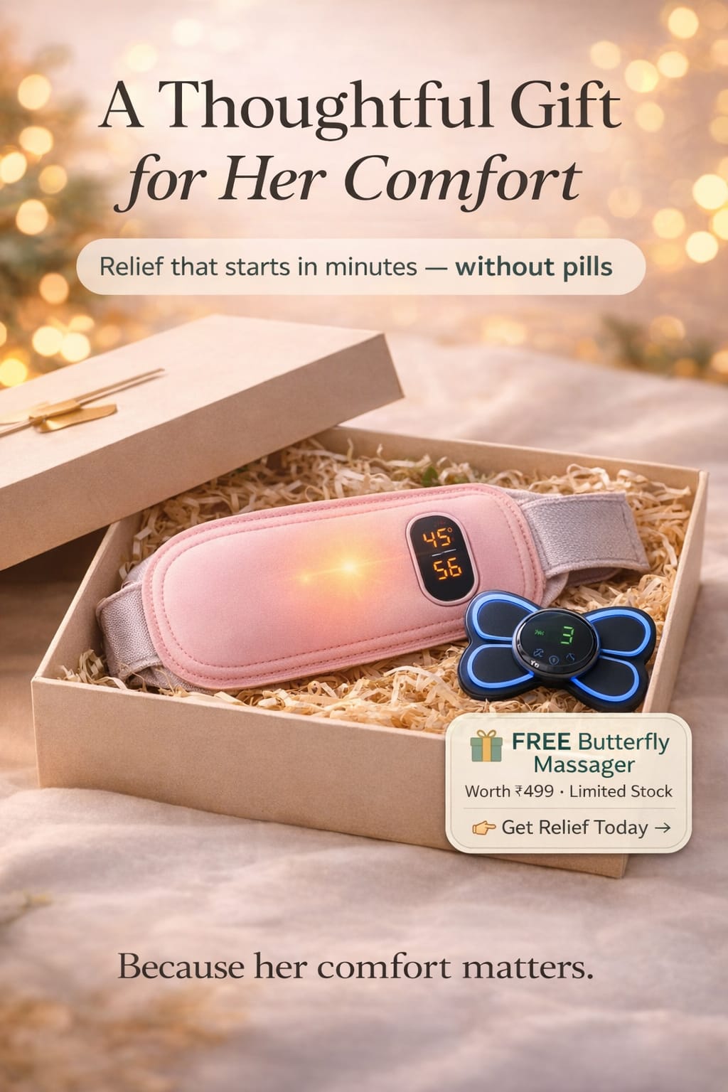 Gentle, targeted warmth that helps her relax and feel better in minutes — without pills or chemicals.
