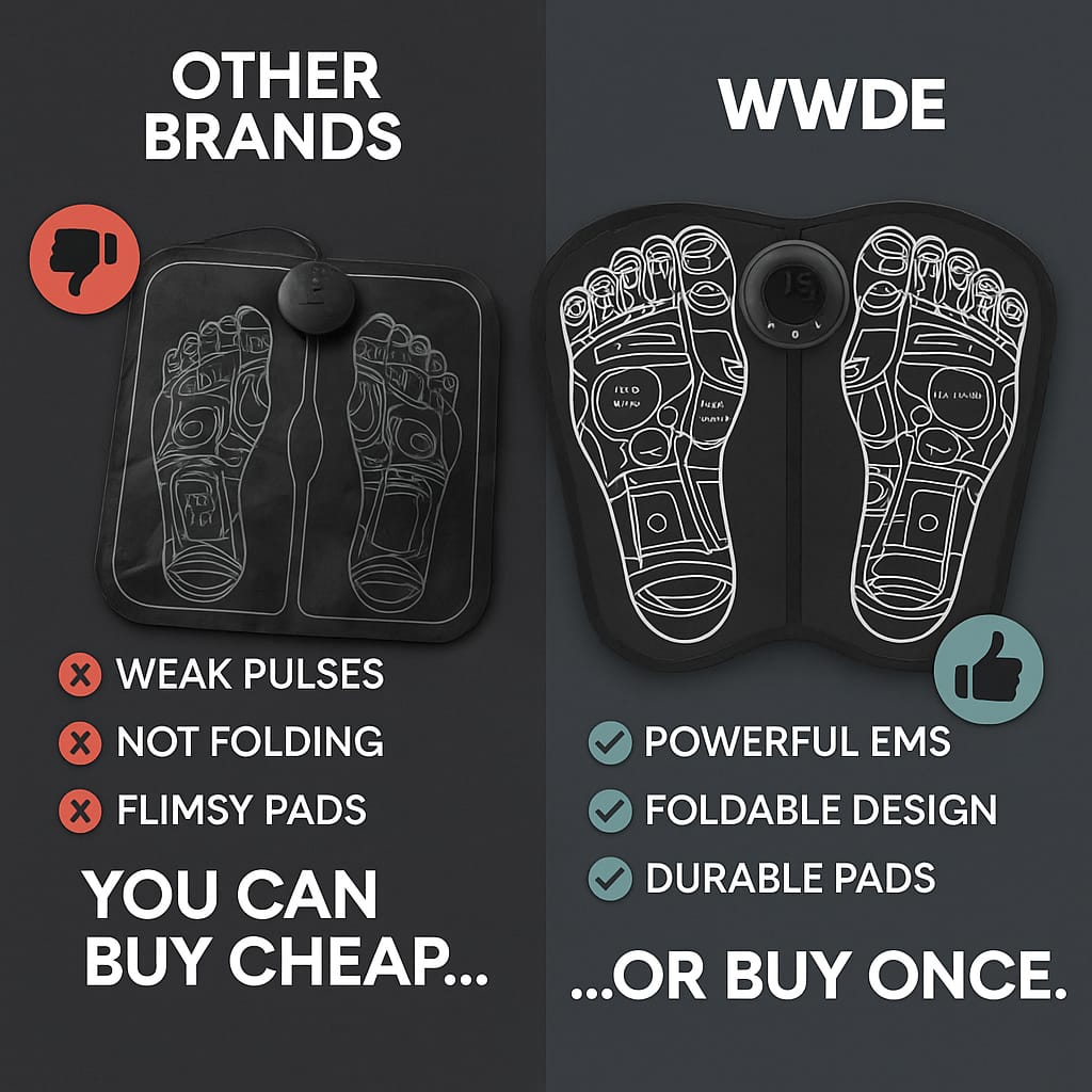 The WWDE™ EMS Foot Massager uses advanced Electrical Muscle Stimulation (EMS) to melt away fatigue, boost blood flow, and reawaken tired soles — all in just 15 minutes a day.